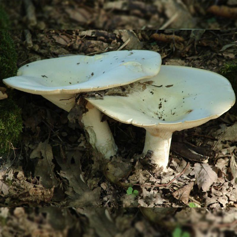 Гриб відноситься до роду Белосвінушка, досить великих розмірів, діаметр капелюшка від 8 до 30 см, на початку росту опуклий, пізніше набуває воронкоподібну форму. Капелюшок має гладку шкірку, яка з часом старіння гриба може розтріскуватися. Має світле забарвлення, часто кремового кольору, а по центру має бурий відтінок.