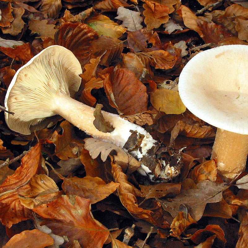 Даний гриб відноситься до роду Клітоцибе, капелюшок гриба має діаметр від 8 до 20 см. У молодих грибів капелюшок випуклої форми, пізніше ставати лійкоподібною з горбком і підвернутими краями. Капелюшок забарвлена в темно-жовтий колір, з часом набуває вигорілий колір, практично білий.