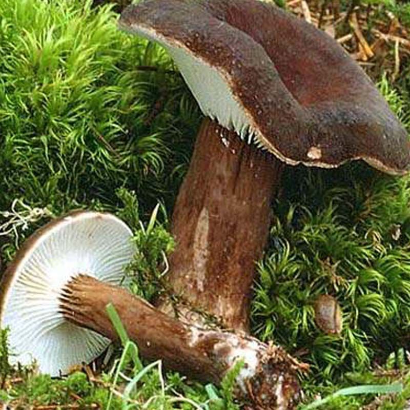 Ніжка гриба має висоту від 4 до 10 см., В діаметрі від 1 до 1,5 см., Довгастої циліндричної форми, поверхня оксамитова, близько підстави має біле забарвлення, вся ніжка забарвлена в світло-коричневий колір. У гриба біла м'якоть, на місці зрізу набуває рожевий колір, щільної консистенції, легко ламається. М'якоть гриба має приємний тонкий фруктовий аромат. Сік їдкий, білого кольору.