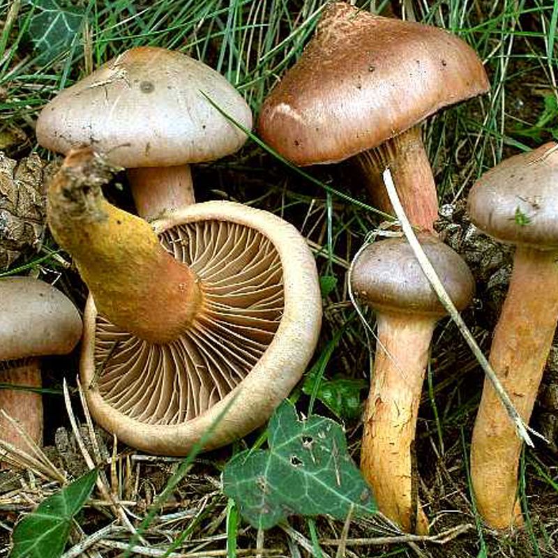 У молодих грибів шар з пластинками закритий слизовим покривалом. Спори мають темно-коричневе забарвлення. Ніжка гриба у висоту становить від 3 до 10 см., В товщину від 0,5 до 1,5 см., Нерівної форми, біля основи вузька, поверхня гладка і забарвлена в світліший колір ніж капелюшок. М'якоть у ніжки волокниста, забарвлення м'якоті може бути від жовтого відтінку до червонуватого. Гриб є їстівним.