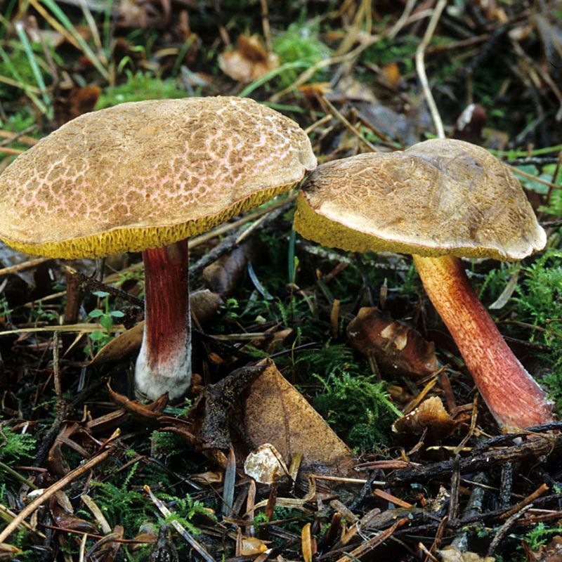 Величина капелюшка в діаметрі становить близько 10 см., досить м'ясистий і має опуклу форму, поверхня суха, пофарбована в бурий колір або коричневий відтінок. На місці тріщин набуває червонуватого відтінку. Шар з трубочками забарвлений в жовтий, у зрілих грибів набуває оливковий відтінок, можуть змінювати відтінок на синій. М'якоть пухкої структури, пофарбована в білий або жовтий колір, на місці зрізу синіє і червоніє. М'якоть на смак солодка, має приємний фруктовий запах. Під шкіркою забарвлення м'якоті червоне.