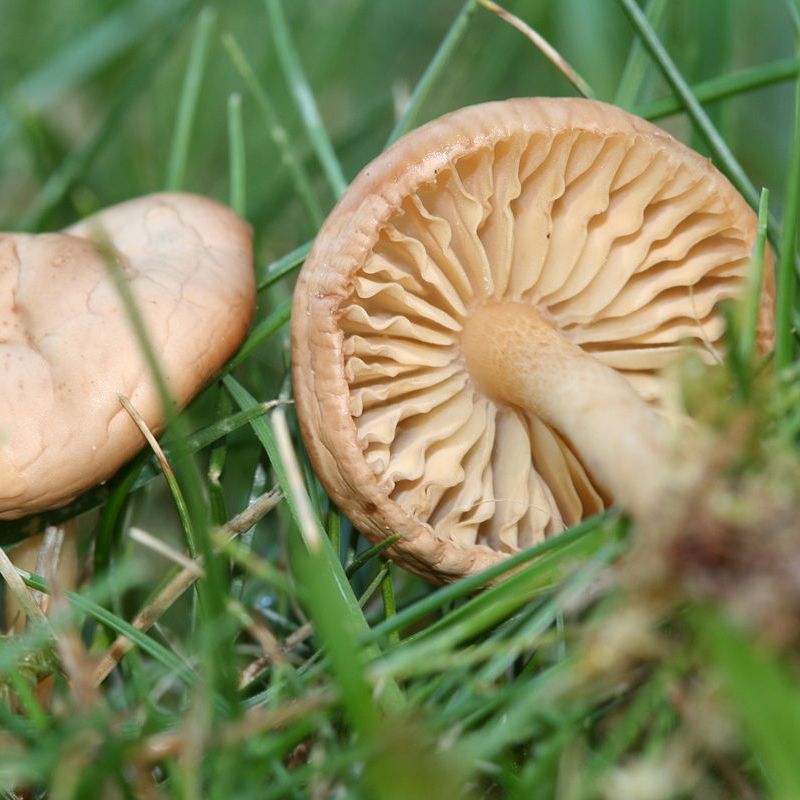 Пластинки шириною 3-6 мм, не часто розташовані, на початку росту, приросли до ніжки, потім стають вільними. При високій вологості, пластинки кольору охри, а в суху вони кремово-білі. Спори мають форму яйця, не мають кольору.