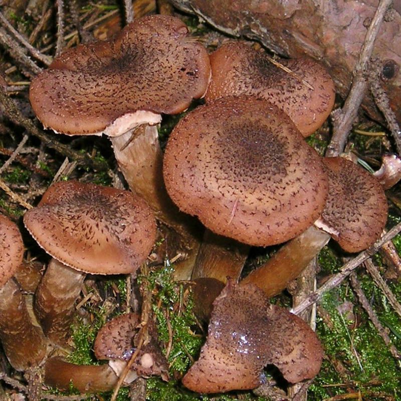 Даний гриб також відомий під назвою опеньок грунтовий, оскільки виростає тільки на відмерлій деревині, близько пнів і повалених дерев. Віддає перевагу рости на багатому грунті, часто в змішаних лісах. Капелюшок забарвлений в жовто-коричневий колір, діаметр близько 10 см., З часом з випуклої форми стає плоскою. На поверхні присутні лусочки темного кольору, а по краю звисають залишки від покривала білого кольору. Близько підстави ніжка розширюється, на поверхні добре видніється кільце. М'якоть білого кольору, колір суперечка охряний. Гриб є їстівним, його легко розпізнати, зустрічається на останках хвойних дерев, у великих групах.