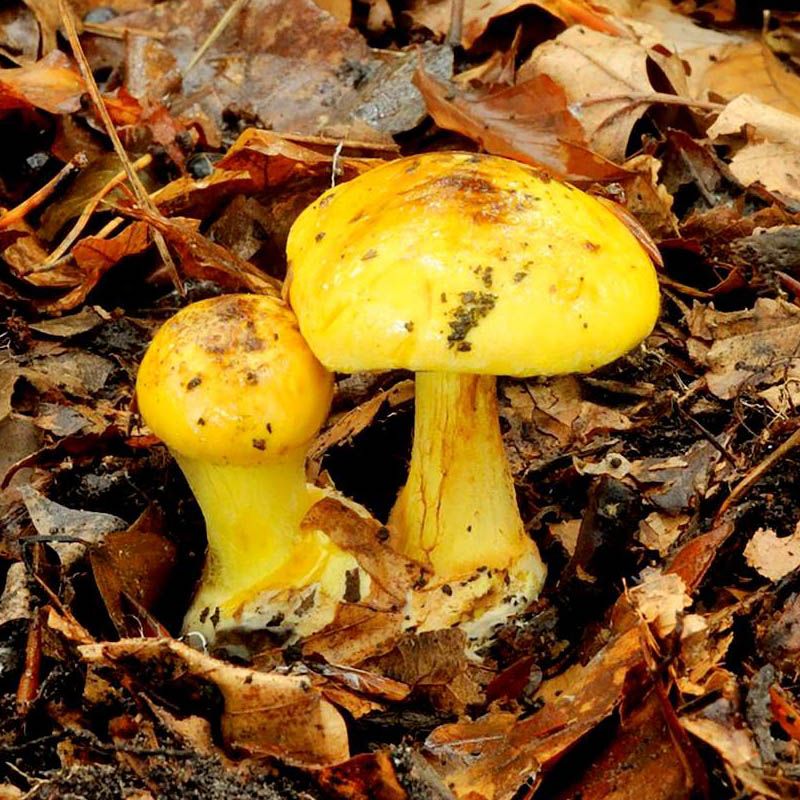 Капелюшок гриба в діаметрі близько 4-12 см., Форма полушаровидна, пізніше набуває опуклу форму, на поверхні присутній слиз, по центру видно лусочки. Забарвлення капелюшка сірого кольору з жовтим відтінком, або оливкового забарвлення. Пластинки приростають до ніжки, у молодих грибів пофарбовані в жовтий колір, з часом набувають зеленуватий відтінок. Покривало схоже на павутину, жовтого забарвлення. Висота ніжки близько 4-8 см., В товщину 1-2 см., До низу потовщується, забарвлення у ніжки гриба яскраво-жовта.
