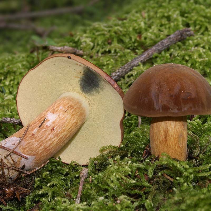 М'якоть гриба щільної структури, білого або жовтуватого забарвлення, на місці зрізу набуває синього кольору. У м'якоті приємний запах, і м'який грибний смак. Шар з трубочками приростає до ніжки, забарвлений в жовтий колір, або зелений колір, довжина трубочок близько 2 см., З білими порами, можуть змінювати колір на синій.