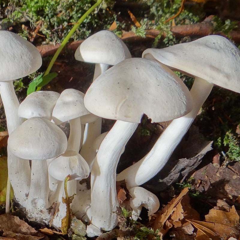 Пластинки, що розташовуються під капелюшком близько розташовані, тонкі і вузькі, приростають до ніжки. Спори білого забарвлення, ніжка гриба зростає від 3 до 7 см., Поверхня капелюшка гладка, з щільними волокнами, близько капелюшка розширюється. Плодові тіла зростаються і плутаються між собою.
