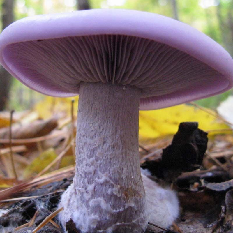 Капелюшок гриба має незвичайне забарвлення, у молодих грибів фіолетового кольору, з часом стає лілового кольору, може мати коричневий відтінок. Форма капелюшка плоска, щільної структури, має нерівні краї. Шар з пластинками також має фіолетовий відтінок, пластинки близько розташовані, тонкі, з часом стають лілового забарвлення. Спори пофарбовані в рожевий колір. Ніжка у висоту росте 4-8 см., В товщину 1,5-2,5 см., Володіє волокнистою структурою, на поверхні гладка, має світло-лілове забарвлення.