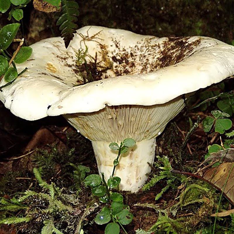 Гриб з сімейства Сироїжкових, капелюшок в діаметрі від 8 до 26 см., Хорошої щільної і м'ясистої структури. Форма у капелюшка має опуклу форму, пізніше стає схожа на воронку, краї мають хвилясту форму. Поверхня капелюшка білого кольору, ворсиста, зрілі гриби мають жовте забарвлення з більш темними рудими плямами. Шар з пластинками білого забарвлення, в ширину 0,4-0,7 см., Рідко розташовані, суперечки також пофарбовані в білий колір, мають довгасту форму.