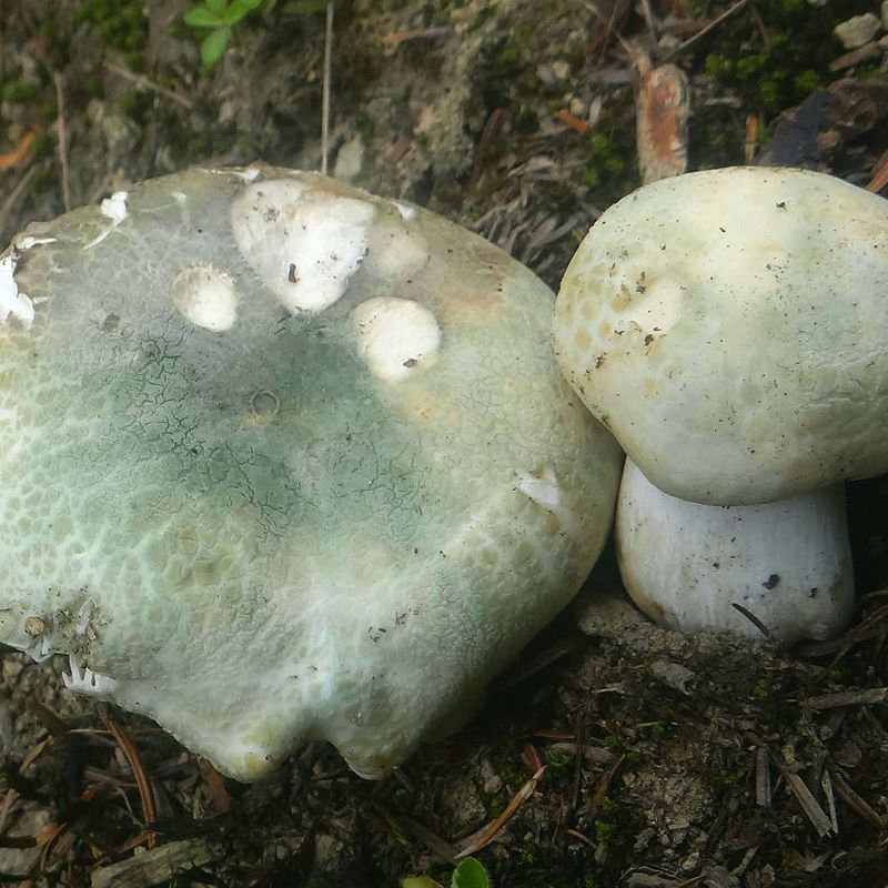 Даний вид грибів відноситься до сімейства Сироїжкових, гриб відноситься до їстівних, один з найцінніших в даному роді. Забарвлення капелюшка має зелений відтінок, іноді з сірим кольором, а іноді і з відтінком охри. Діаметр капелюшка від 5 до 15 см., Спочатку має форму півсфери, пізніше стає опуклою по краях і втиснутою по центру. Шкірочка може розтріскуватися на лусочки, пластинки близько розташовані один від одного, до ніжки не приростають, пофарбовані в кремовий колір з темними плямами.