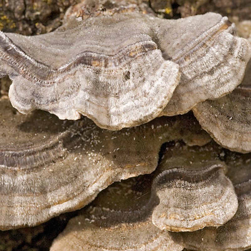 У центрі гриб чорного кольору, злегка зеленуватого від моху зі світлою хвилеподібною облямівкою.