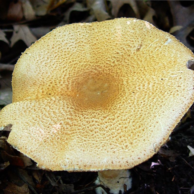 Капелюшки діаметром від 5 до 20 см, у молодого гриба круглі за формою, у міру зростання стають дзвінковидними та в кінці розпростертими. Зовнішня тканина капелюшка гладка, суха, біла з жовтуватим відтінком, а при травмуванні помітно жовтіє.