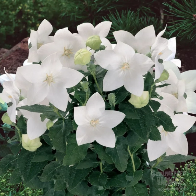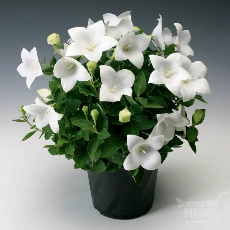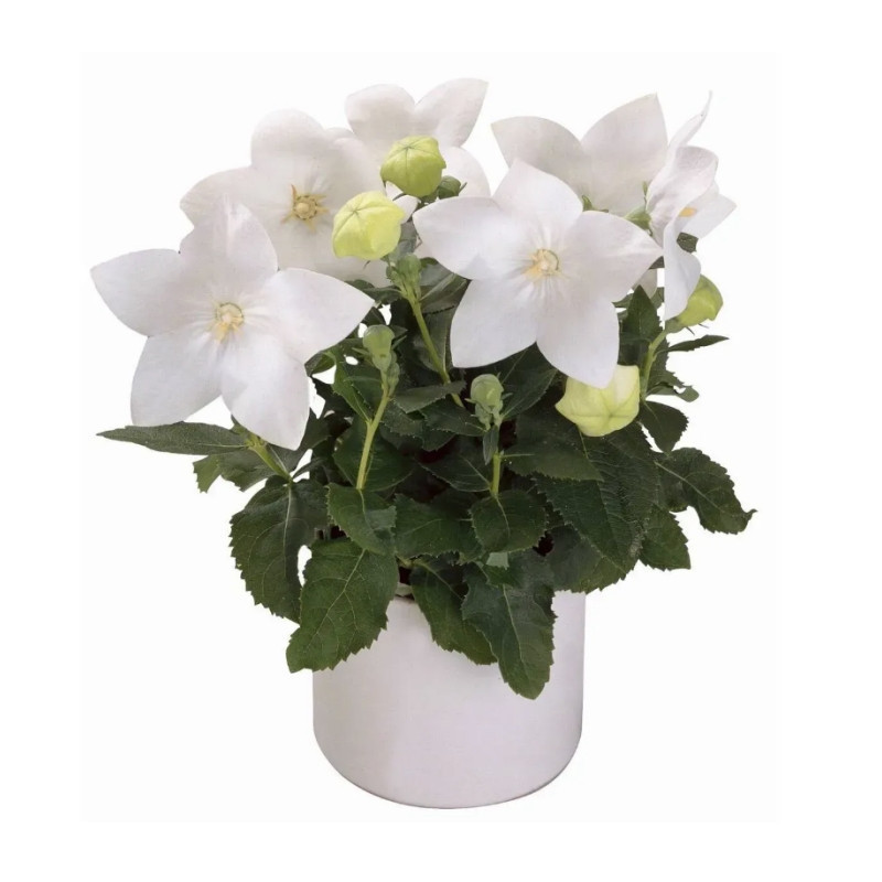 Платикодон Астра F1 біла (White) - чудова довгоквітуча багаторічна рослина, утворює компактний, рівномірно розгалужений кущик з великими, немов роздутими, бутонами і напівмахровими ширококолокольчатими квітами білого забарвлення на густо облиствених сизуватих пагонах.