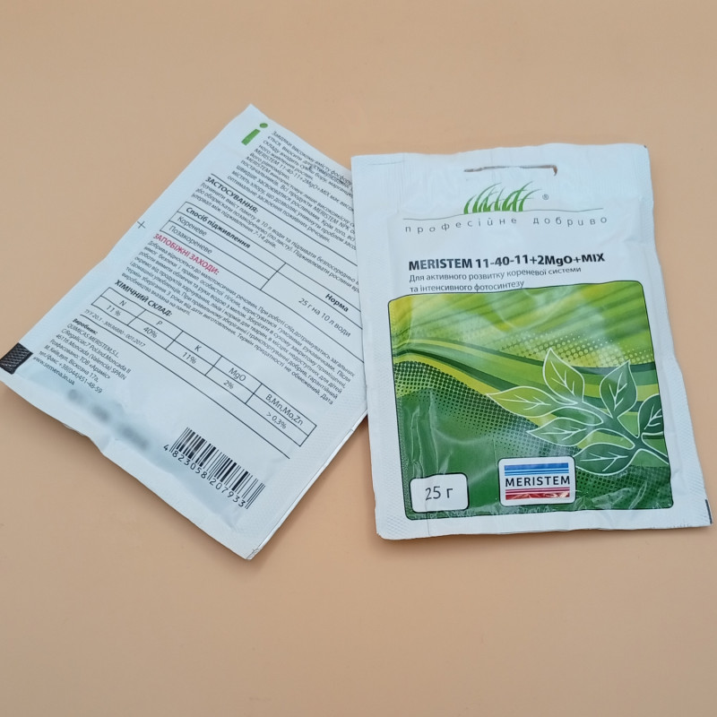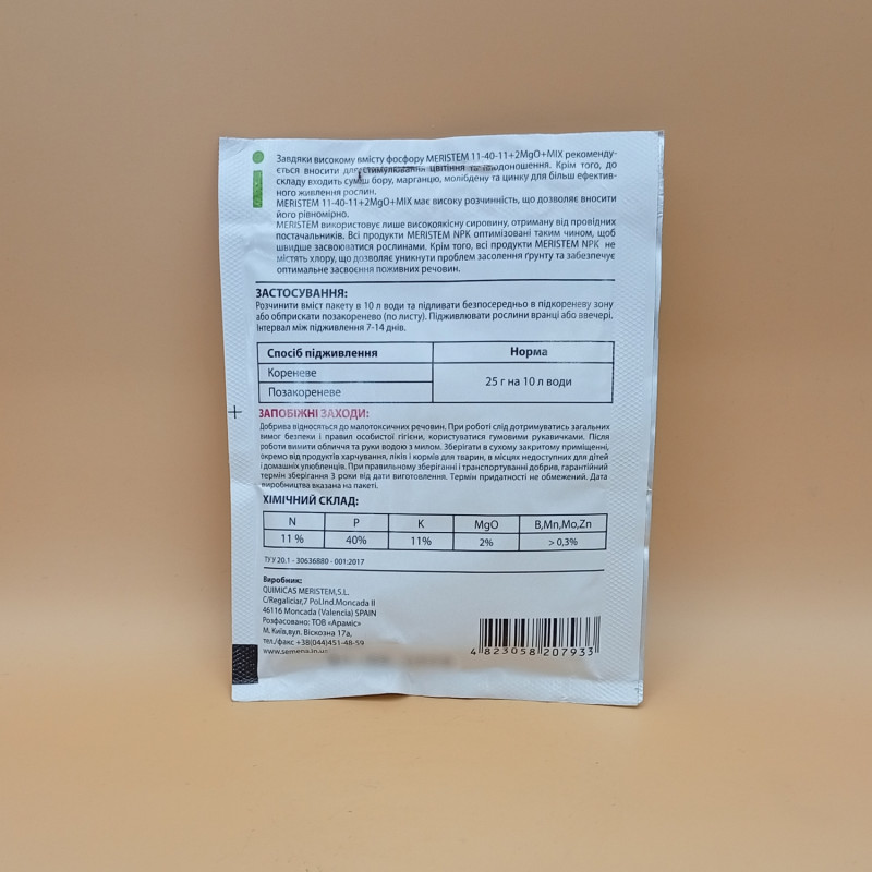 Азот загальний (N) - 11,0% в тому числі: - нітратний азот (N) - 3,1% - амонійний азот (N) - 7,9% Фосфор (P2O5) - 40,0% Калій ( K2O) - 11,0% Оксид магнію (MgO), EDTA - 2,0% Бор (B) - 0,02% Цинк (Zn) - 0,15% Марганець (Mn) - 0,15% Молібден (Mo) - 0,002%
