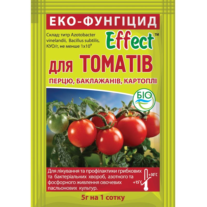 Ефект для томатів - комплекс мікроорганізмів і ферментів (Azotobacter vinelandii, Bacilus subtilis). Ефективний біопрепарат для лікування і профілактики грибкових і бактеріальних хвороб, азотного і фосфорного живлення томатів.
