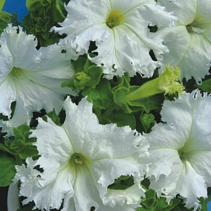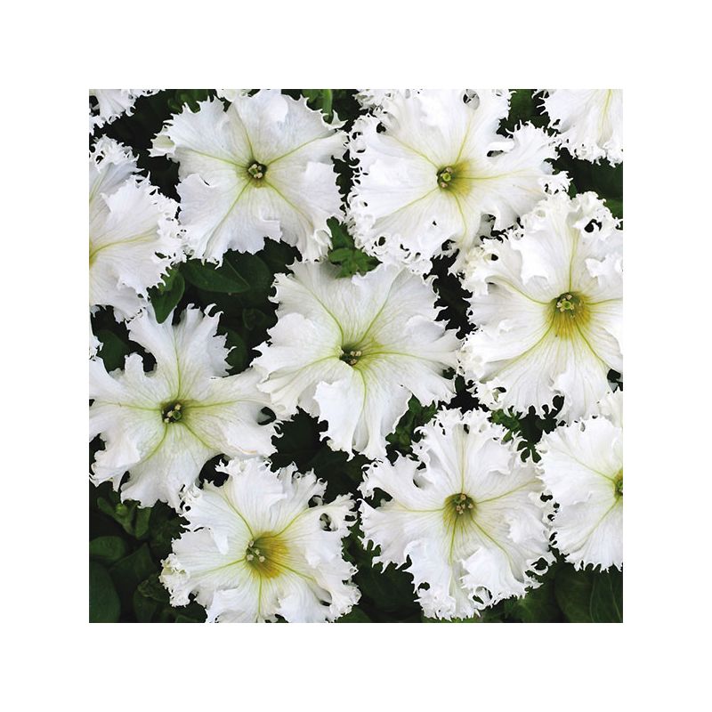 Великі квітки білого забарвлення з хвилястими і бахромчастими краями діаметром 8 см. Кущ акуратний висотою 35 см. Сорт особливо підходить для посадок в горщики, балконні ящики і на клумбі.