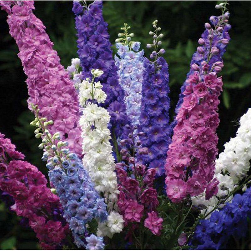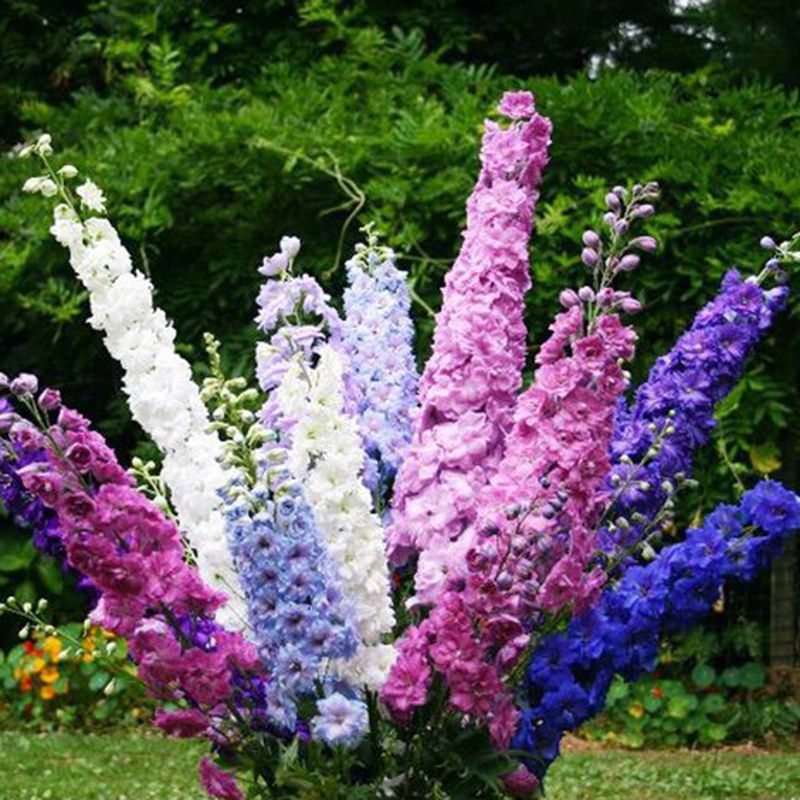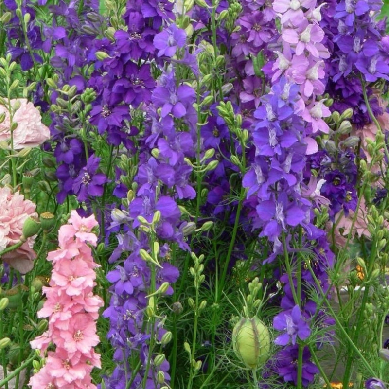 Повітряні суцвіття дельфініума підносяться над хмарою витонченого темно-зеленого різьбленого листя.