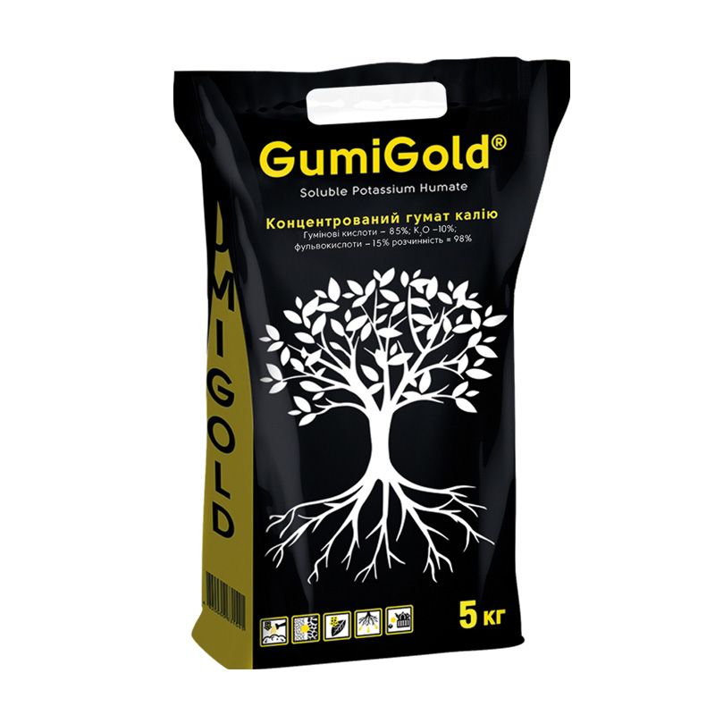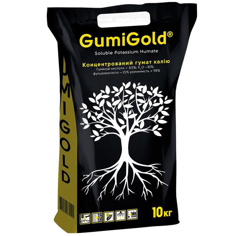 Гумі Голд - концентрований гумат калію. Забезпечує зростання врожайності на 10-25% і скорочення термінів дозрівання на 10-12 днів.