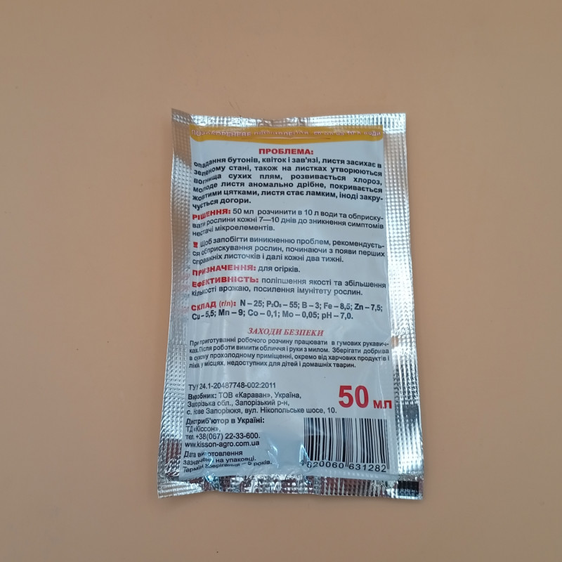 Склад (г/л): N - 40; P - 70; B - 3; Fe - 8; Zn - 8; Cu - 6; Mn - 6; MgO -5; Co - 0,1; Mo - 0,05; pH - 4,3