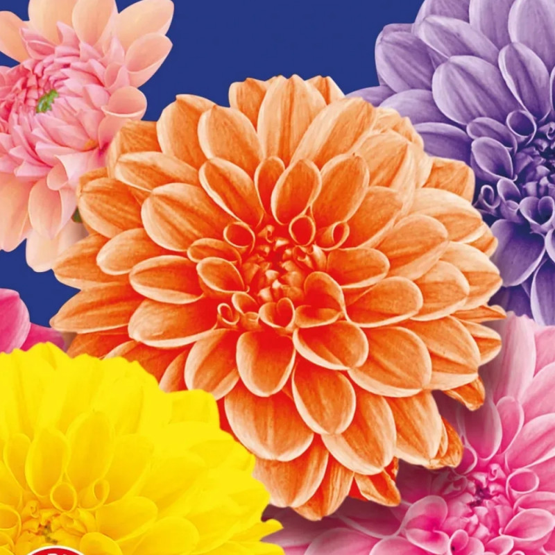 Жоржина Дует помпонна мікс (mix) – дуже ефектний сорт із яскравими, оригінальної форми суцвіттями.