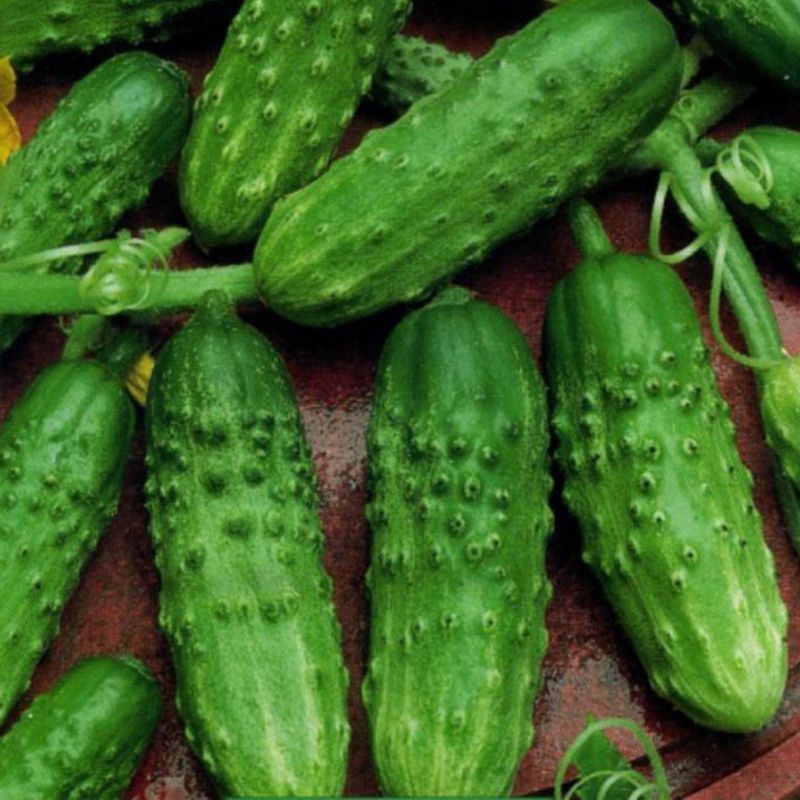 Характеристика плодів – У пазухах формує по 3-5-7 зав'язі. Плоди мають красиву циліндричну форму довжиною 8-11 см. Зеленці горбкуваті, білошипні, яскраво-зеленого кольору. Гібрид має чудові смакові і засолювальні якості.