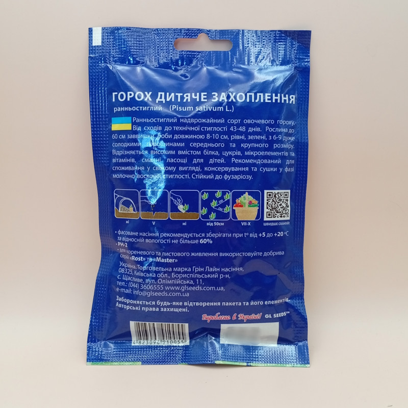 Зелений зморшкуватий мозковий горох.Дуже ранній, перший плодоносний вузол 8-й або 9-й.
