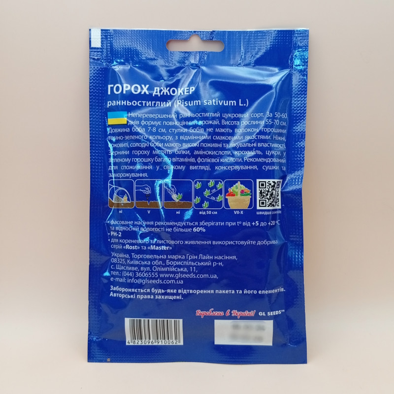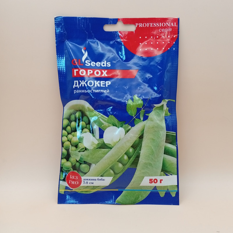 Горох «Джокер» - чудовий раннеслелий цукровий сорт. За 50-60 днів формує повноцінний урожай. Висота рослини 55-70 см, довжина бобу 7-8 см, стулки бобів не мають волокон, горошини темно-зеленого кольору, з відмінними смаковими якостями.