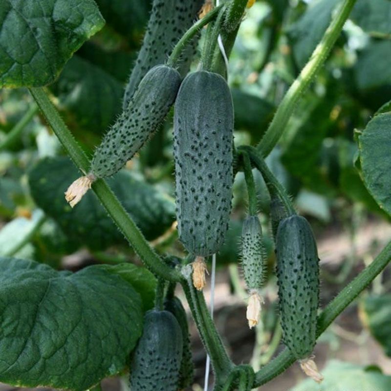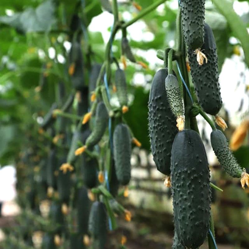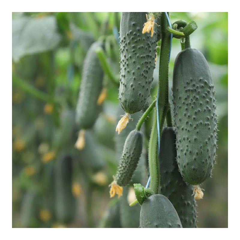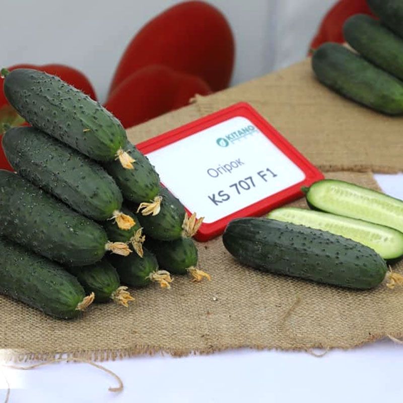Характеристика плодів – Плоди однорідні, крупнобугорчасті, темно-зеленого кольору, в одній пазусі формується 3-5 плодів довжиною 10-12 см. Щільна внутрішня структура з маленькою насіннєвою камерою. Генетично відсутня гіркота плодів. Відмінні смакові якості, хрусткі, соковиті плоди. При переростанні плоди не стають бочковидними.