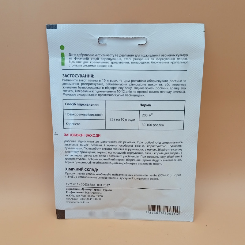 Добриво не містить азоту і є ідеальним для підгодівлі овочевих культур на фінальній стадії вирощування, етапі освіти і формування плодів.
