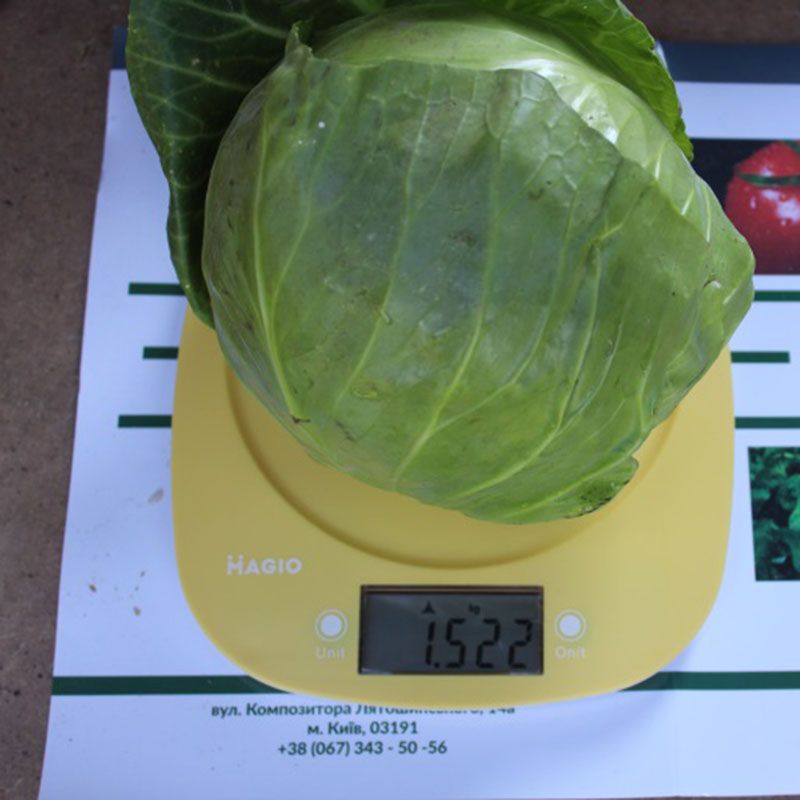 Характеристика плодів – Формує округлі головки хорошого світло-зеленого кольору високої однорідності. Головки щільні, вагою 0,8-1,2 кг (залежно від густоти посадки і до 1,5 кг), мають відмінні смакові якості. Характерною ознакою гібрида є висока щільність головок на ранніх термінах дозрівання, що дозволяє реалізовувати продукцію, починаючи від 350 г.