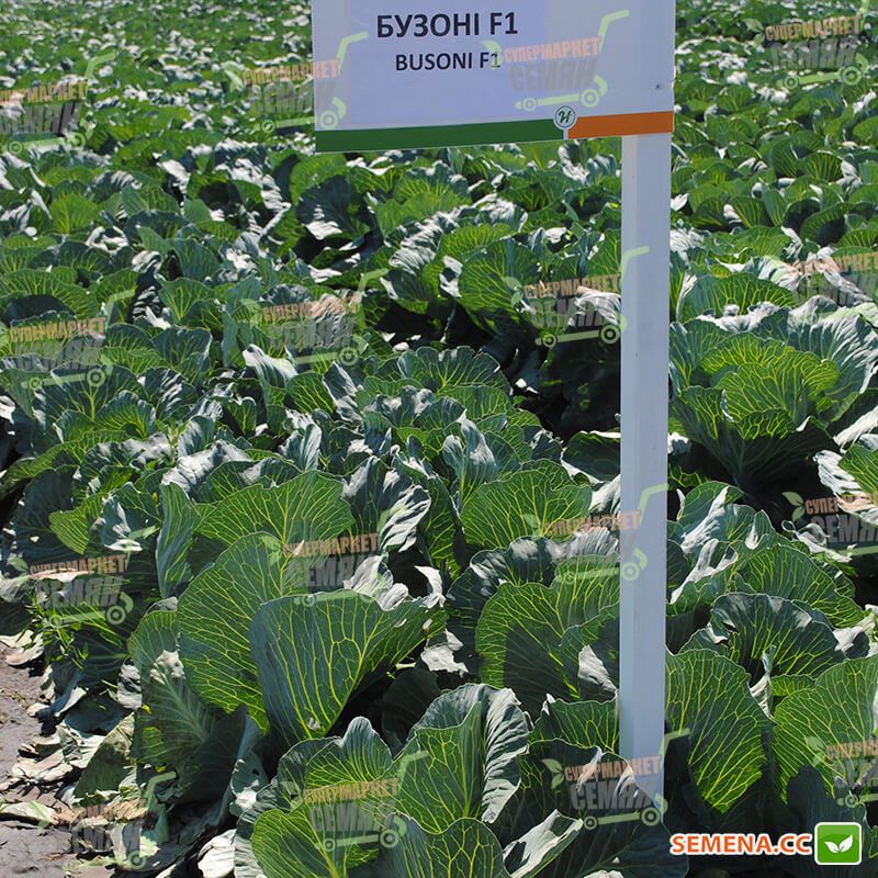 Бузоні F1 - це середньопізній гібрид білокачанної капусти, у якої період вегетації триває чотири місяці (120 - 125 днів). У цієї рослини добре розвинена коренева система, листя темно-зеленого кольору, з сильним восковим нальотом. Качани мають округлу форму, вони щільні, тверді, масою досягають до 3 кілограм. Цей гібрид толерантний до ураження трипсами стійкий до фузаріозу. Його можна зберігати до 7 місяців.