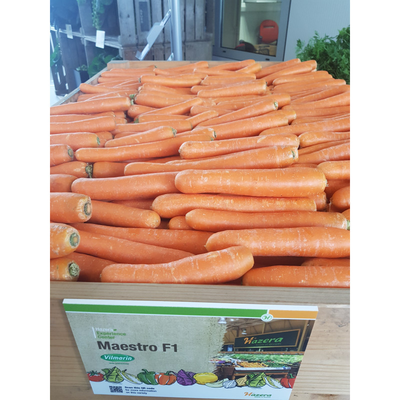 Маестро Ф1 - це пізньостиглий гібрид моркви Нантського типу, який призначений для свіжого ринку, тривалого зберігання та вирощування в основний період. Вегетаційний період 120 - 130 днів. Листовий апарат добре прикріплений до коренеплоду, темно-зеленого забарвлення. Коренеплоди циліндричної форми, однорідні, яскраво-жовтого кольору, довжиною близько 20 сантиметрів. Цей гібрид стійкий до альтернаріозу, ямкової плямистості і сріблення під час зберігання. Можна вирощувати по всій Україні.