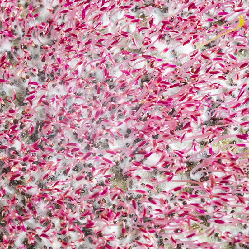 Покладіть на дно тари обраний субстрат і зверху рівномірно розподіліть насіння, так щоб вони покрили всю площу, уникаючи утворення грудок. Потім насіння і субстрат добре зволожте з розпилювача. Після поливу накрийте тару кришкою і поставте в тепле темне місце.