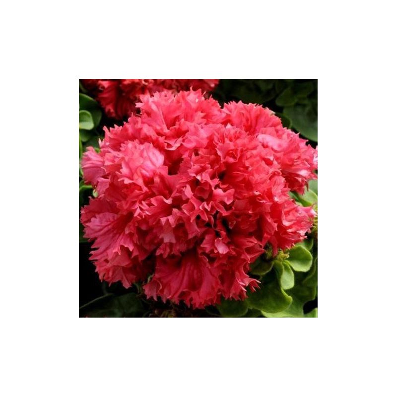 Квітки великі, діаметр 7-10 см, густо махрові, з сильно гофрованими пелюстками , яскраво-червоного забарвлення.
