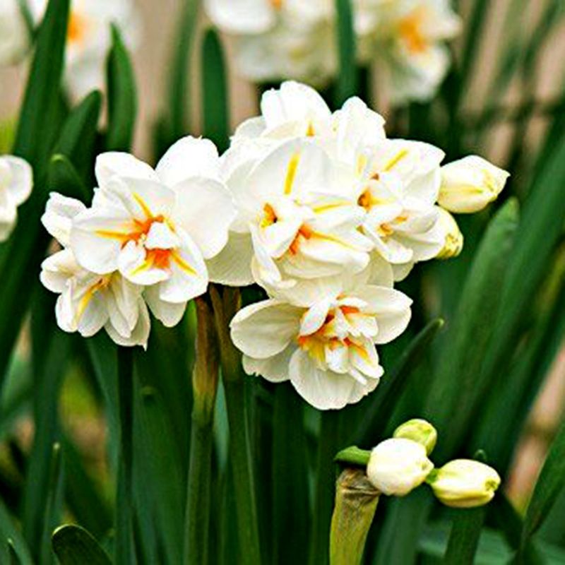 На одному квітконосі формується до 4-5 бутонів, квітконоси високі, міцні 45-60 см. Нарцис утворює кремово-білі пелюстки з помаранчевими відблисками, оранжево-червоне серце айстровидних квіток у вигляді махрової розщепленої корони.