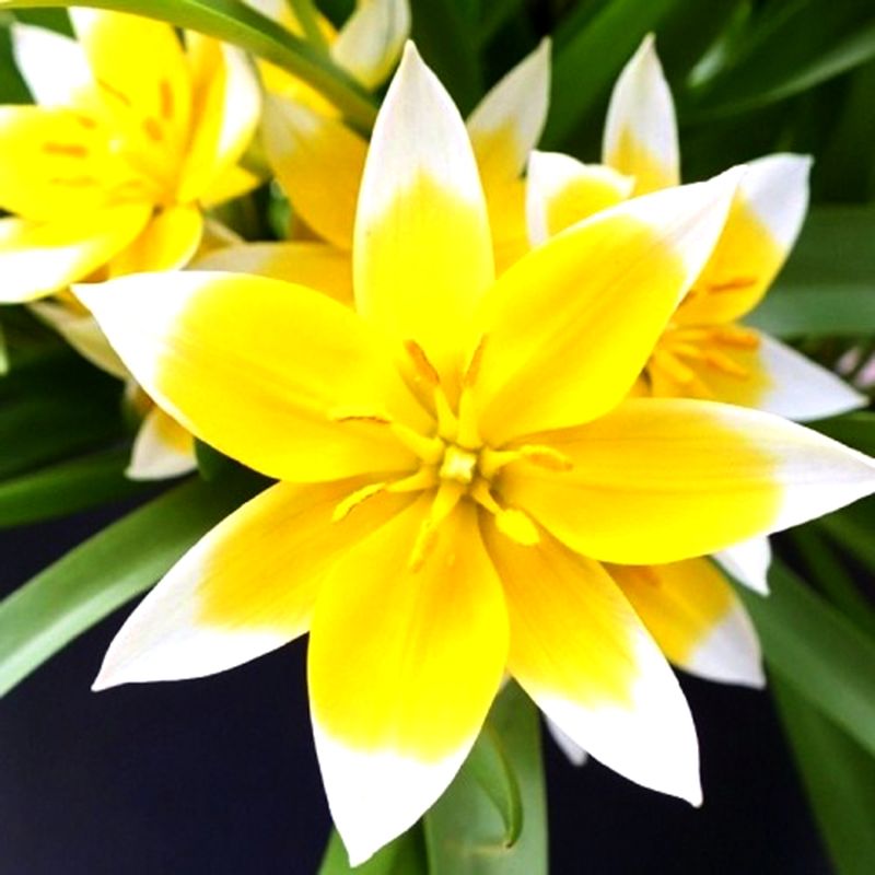На кожному квітконосі по одній квітці ніжно-жовтого кольору з широкою білою окантовкою. Гострі пелюстки широко розкриваються в процесі цвітіння.