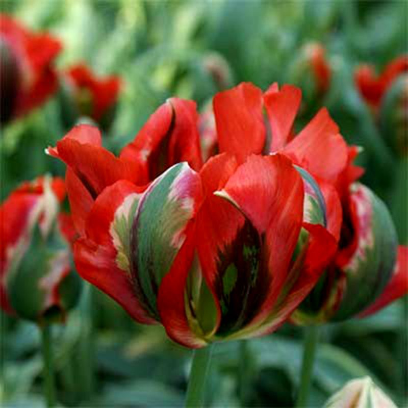 Квіти 6-10 см заввишки, листя дрібне, вузьке. Середина пелюсток, що має зелене забарвлення, зазвичай потовщена. Цвітуть зеленоквіткові тюльпани з середини травня, використовуються в основному для оформлення садів і парків, а також для зрізання.