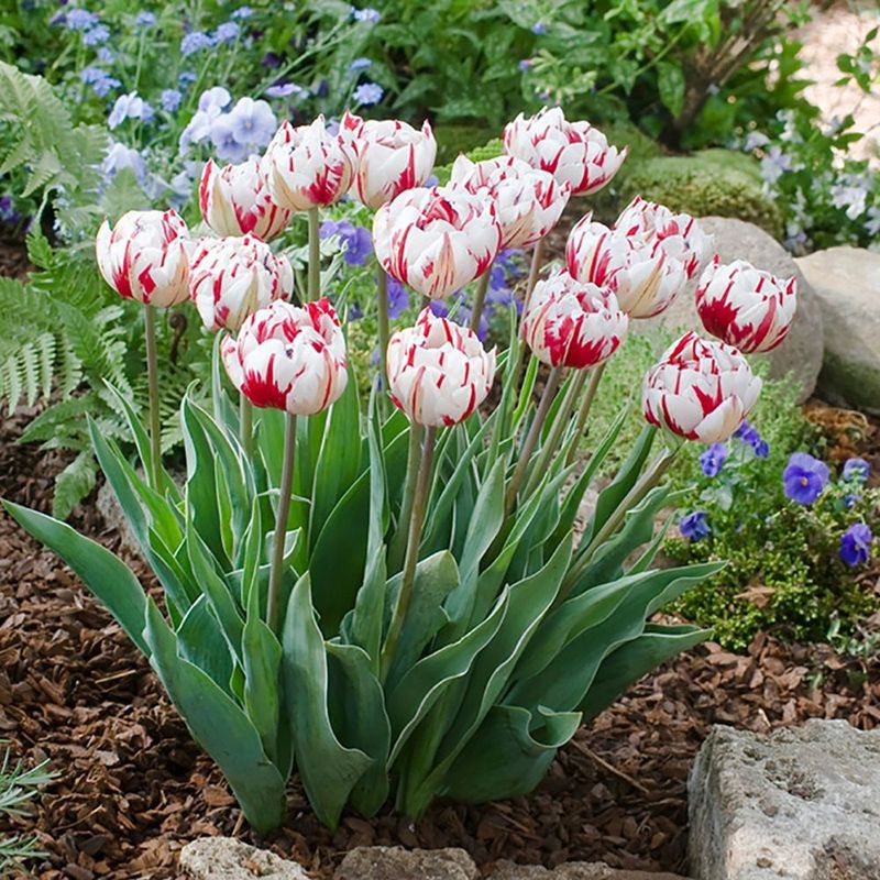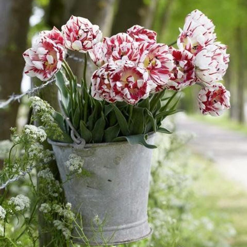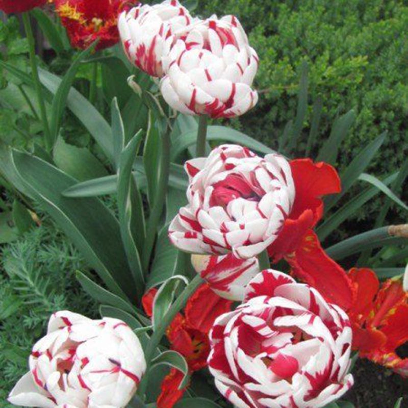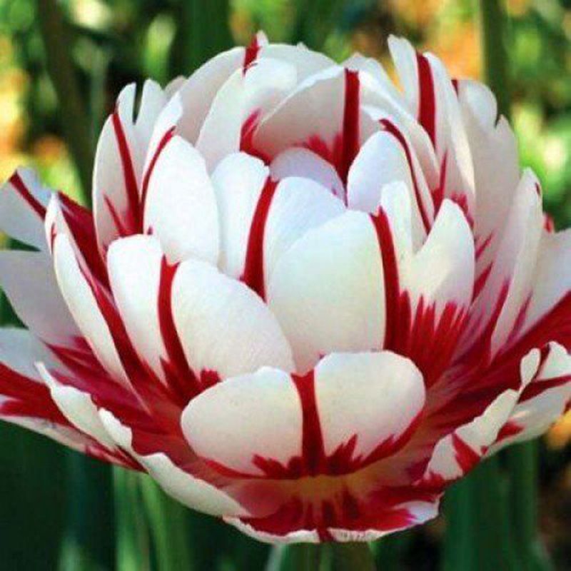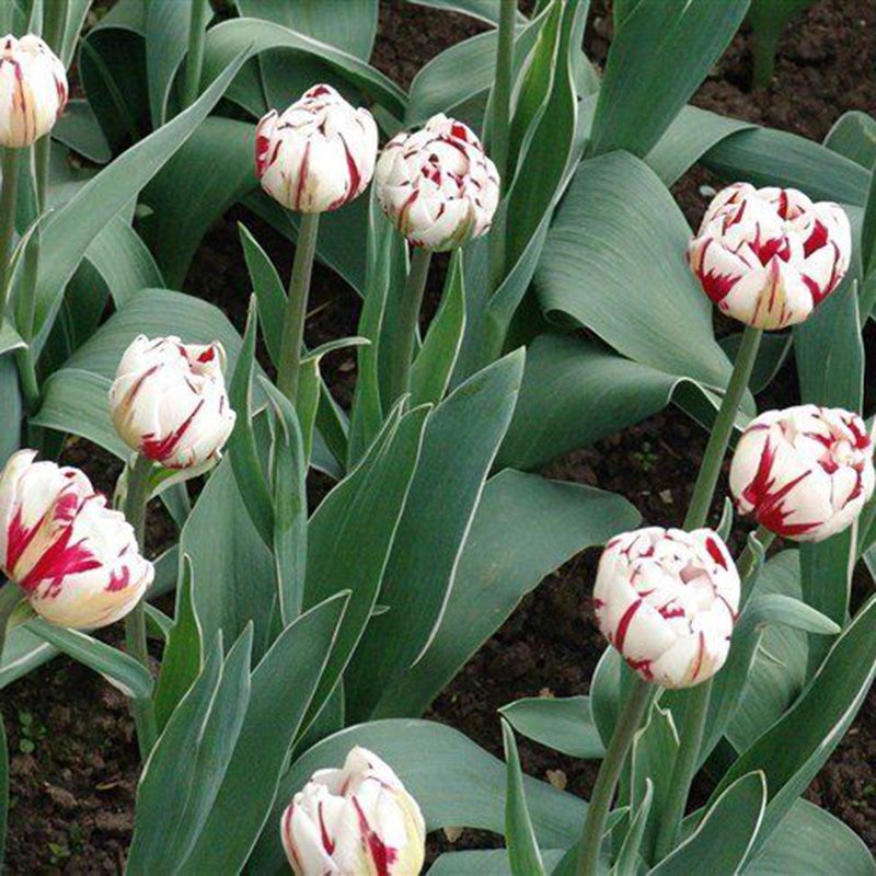 Квіти махрові, білі з червоними смугами, в повністю розкритому стані можуть досягати в діаметрі 10 см, довго не в'януть. Терміни цвітіння – ранні (травень).