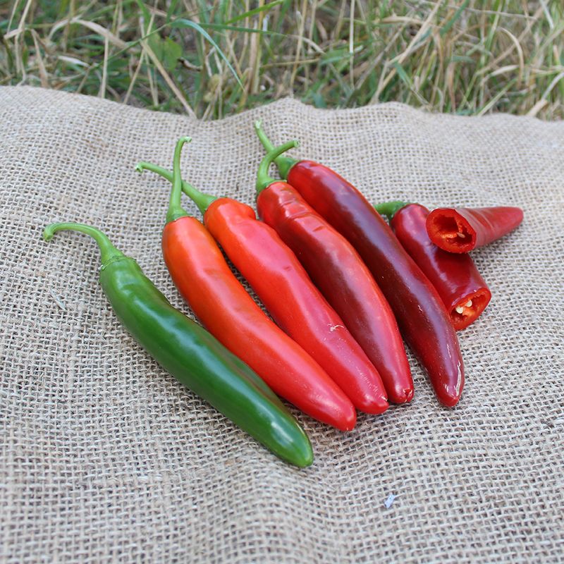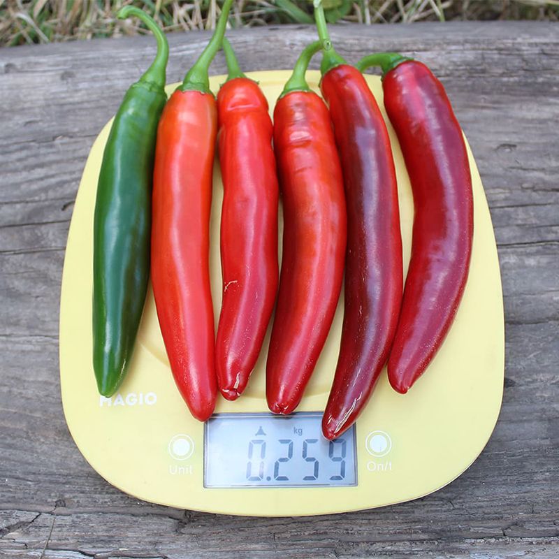 Характеристика плодів – Гібрид формує однорідні вирівняні плоди, помірно гострі на смак. Розмір плоду: 16х2,5 см. Колір у технічній стиглості – глянсовий темно-зелений, у біологічній – глянсовий червоний. Вага плоду – 30-40 г.