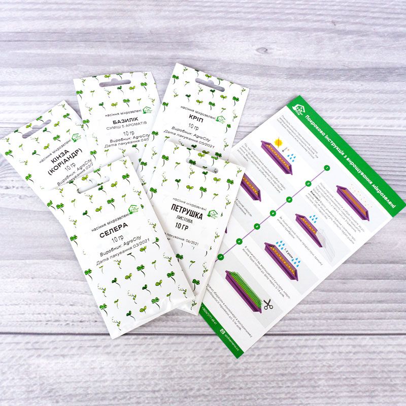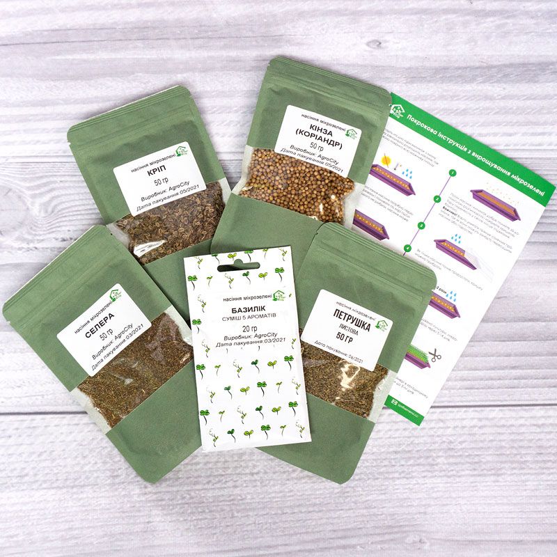Набір насіння мікрозелені Для перших страв (базилік 5 ароматів, кінза, петрушка листова, селера, кріп) – це набір мікрозелені, який добре розкриває і вдало доповнює смак перших страв.
