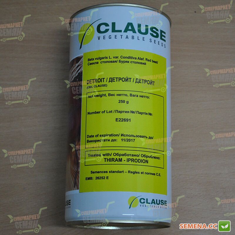 На фото представлена оригінальна упаковка насіння буряка столового «Детройт» номіналом 250 г компанії «Clause/Клоз». Насіння зберігається в металевій банці. Це дозволяє захистити насіння від сонячного впливу,пошкоджень та зайвої вологи. Інформація на упаковці подана 3 мовами : Англійській, українській та російській.