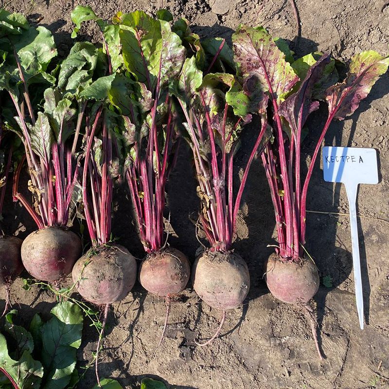 Характеристика плодів – Коренеплоди округлі, вирівняні, гладкі, темно-червоного забарвлення. Вміст цукру 9-12%. Відрізняється слабкою кільцеватістю, високим урожаєм і високою смаковою якістю коренеплодів. Коренеплоди формуються округлої форми з гладенькою поверхнею. Мають стійкий колір після переробки, що дозволяє використовувати його на виготовлення соку та ін. Середня вага коренеплоду 250 г.