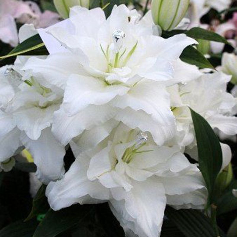 Квіти махрові, білі, діаметром до 20 см. Мають приємним запахом. Цвітіння рясне.