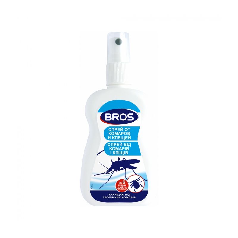 Спрей від комарів і кліщів захист до 6 годин Bros – інсектицид, який відлякує комарів, кліщів і інших кусючих комах, тим самим гарантуючи захист від хвороб та інфекцій, що передаються людям при їх укусах (менінгіт, енцефаліт, хвороба Лайма).