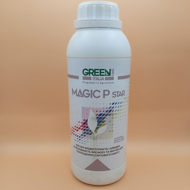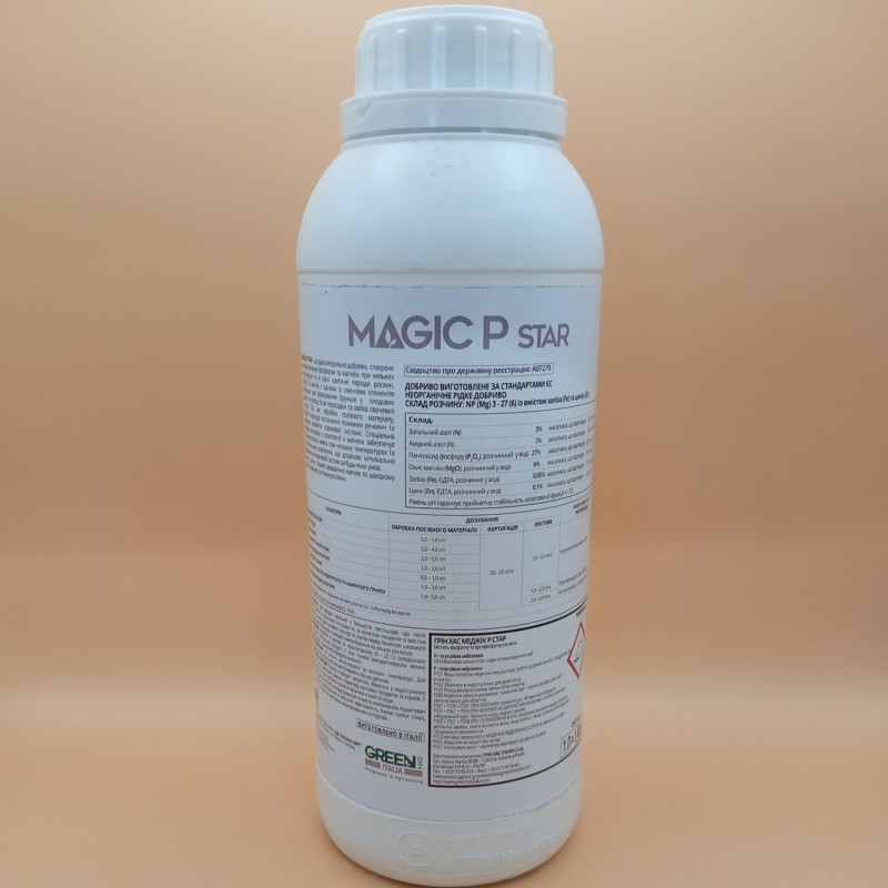 Добриво Меджік П Стар (Megic P Star) – це рідке мінеральне добриво, створене для забезпечення рослин доступним фосфором та магнієм у критичний період розвитку рослин. При виявленні ознак фосфорного голодування у вигляді антоціанового забарвлення листя колосових, ріпаку, кукурудзи.