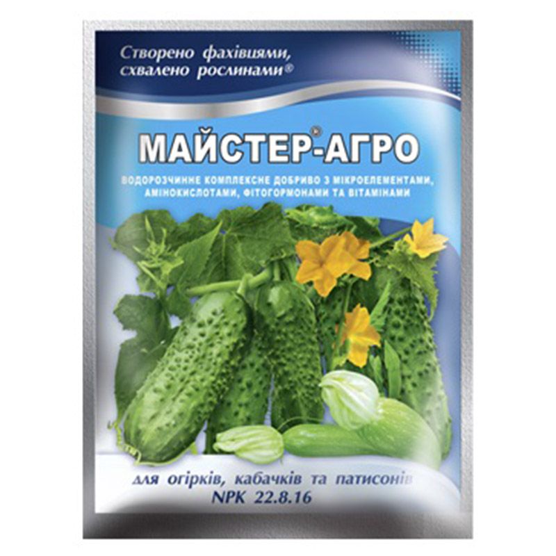 Добриво мінеральне Майстер-Агро для огірків, кабачків і патисонів – універсальне безхлорне, водорозчинне комплексне мінеральне добриво для кореневого підживлення огірків, кабачків, патисонів.