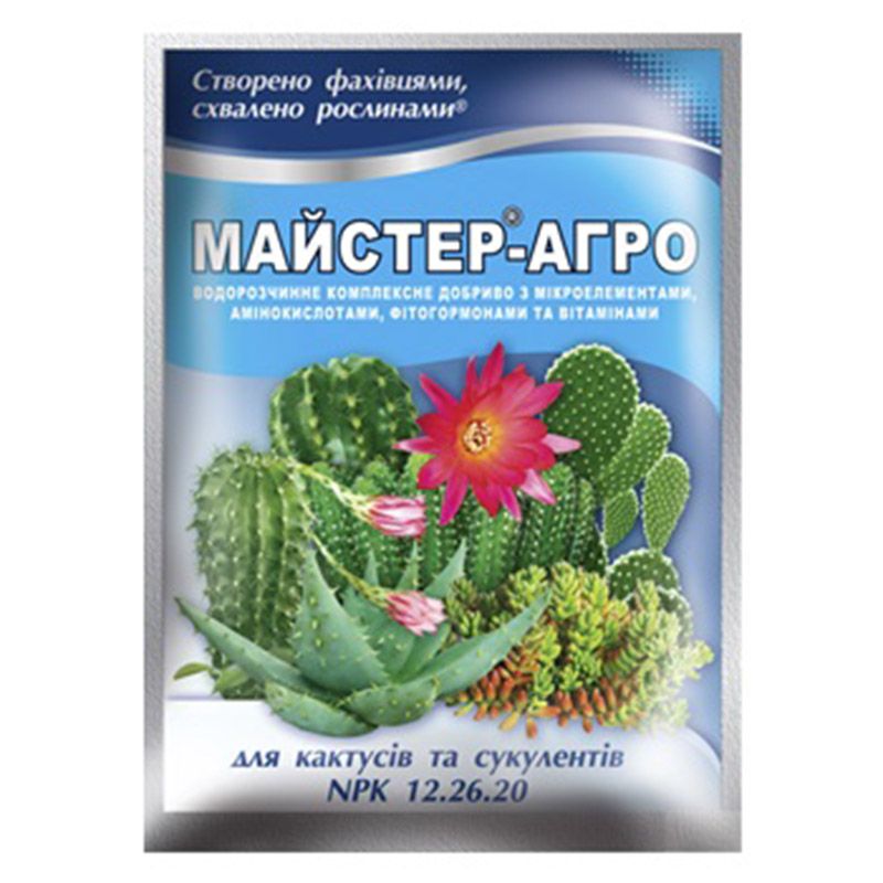 Добриво мінеральне Майстер-Агро для кактусів і сукулентів – універсальне безхлорне, водорозчинне комплексне мінеральне добриво для кореневого підживлення всіх видів кактусів і сукулентів.