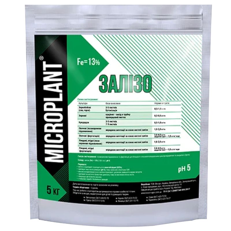 Добриво Мікроплант (Microplant) Залізо Fe 13% – добриво, яке містить високий вміст мікроелемента залізо. Воно застосовується для підживлення сільськогосподарських зернових, овочевих і плодових культур.