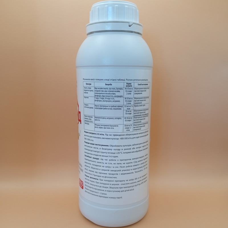 Призначений для ефективного усунення та профілактики спектра бактеріальних, грибкових і вірусних захворювань овочевих культур, плодових дерев, ягідних кущів і винограду, а так само для дезінфекції приміщень різного промислового призначення.