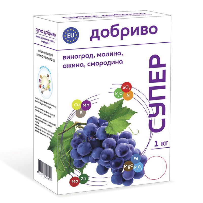 Добриво СУПЕР для винограду, малини, ожини та смородини органо-мінеральне – добриво, яке покращує приживання при посадці; гарне відростання нових пагонів та гарантує відмінні смакові якості плодів.