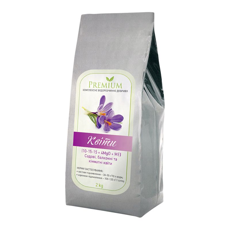 Добриво Преміум Квіти (Premium) 10-15-15+4MgO+МЕ – комплексне водорозчинне добриво з мікроелементами у формі хелатів, призначене для кореневого та позакореневого підживлення садових, балконних та кімнатних квітів.